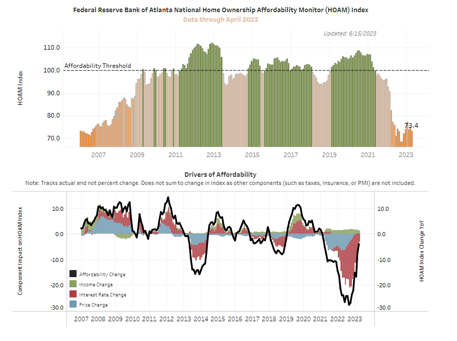 The Federal Reserve Bank of Atlanta tracks the Home Ownership Affordability Monitor Index (HOMA). This is a lagging indicator as it doesn’t reflect monthly prices changes for May and June. Per the chart below, the average home would cost about $3,400 a month (excluding utilities). Someone making $100K a year would struggle to get approved for the mortgage let alone afford the payment. The increasing unaffordability in the housing market has far-reaching implications on individuals and families. Rising home prices not only impact potential buyers but also have consequences for the rental market, as demand for affordable rental housing rises.